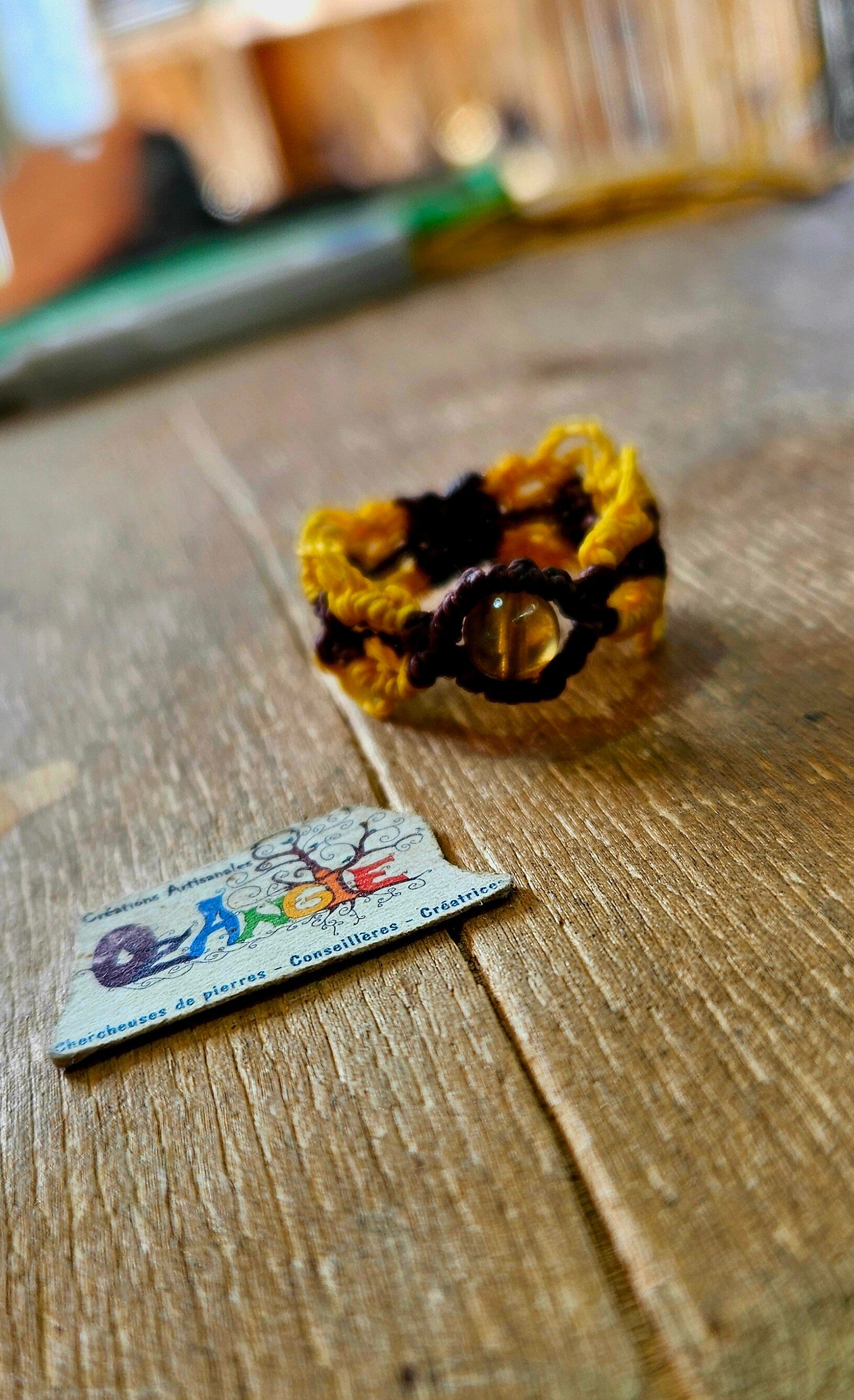 Bague Tournesol Ambre bleue d'Indonésie en micromacramé
